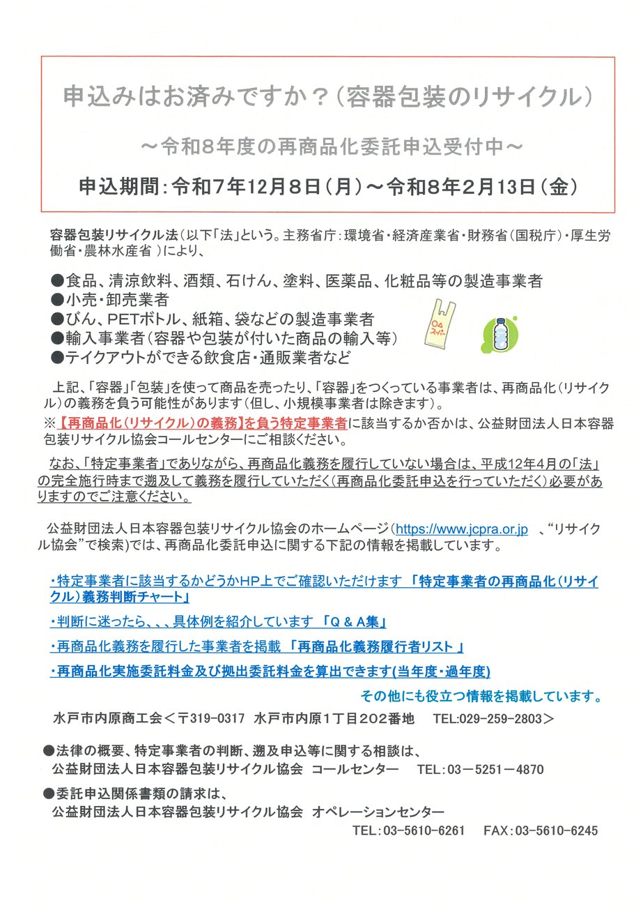 平素から茨城県央地域の商工行政にご協力をいただき,感謝申し上げます。  さて,茨城県央地域9市町村で構成するいばらき県央地域商工振興協議会(事務局水戸市商工課)では,地域内企業の振興を図るため、昨年に引き続き「いばらき県央地域オンライン合同企業説明会(本年度名称:いばらき県央マッチングJOBフェア)」を開催することといたしました。...
